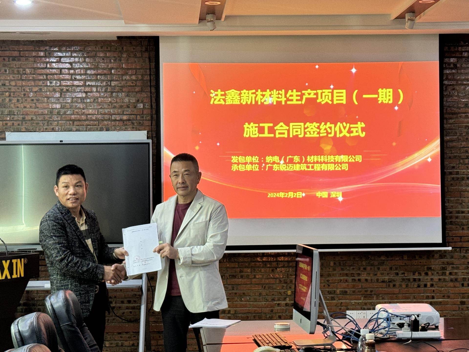 鸿运当头,势不可挡!上下同心,通过一众锐迈人的共同努力,终于在今天2024年2月2日成功签约纳电(广东)材料科技有限公司的法鑫新材料生产项目一期。这不仅仅是一份业绩,更是一份支持!一份信任!感谢纳电(广东)材料科技有限公司对我司的认可和支持!我们一定全力以赴还您一份满意的答卷!